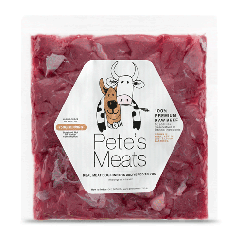 Servings suits any size dog, offering 14 vacuum-sealed, 125g servings of 100% raw, human-grade meat and 125g mixed seasonal veg. The meat is sourced from premium cuts—porterhouse, T-bone, eye-fillet, chuck, silverside, and more—it includes nutrient-rich organ meats. The vegetables are local Braidwood vegetables best suited for dogs like: carrot, pumpkin and green beans.